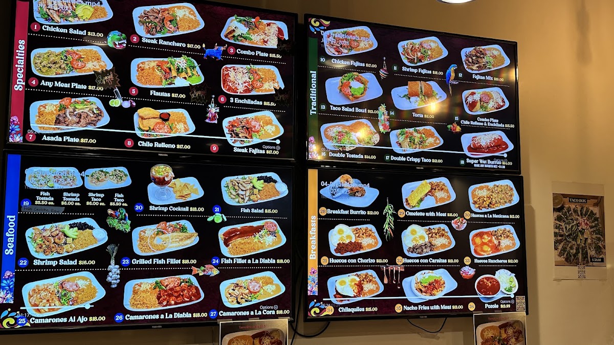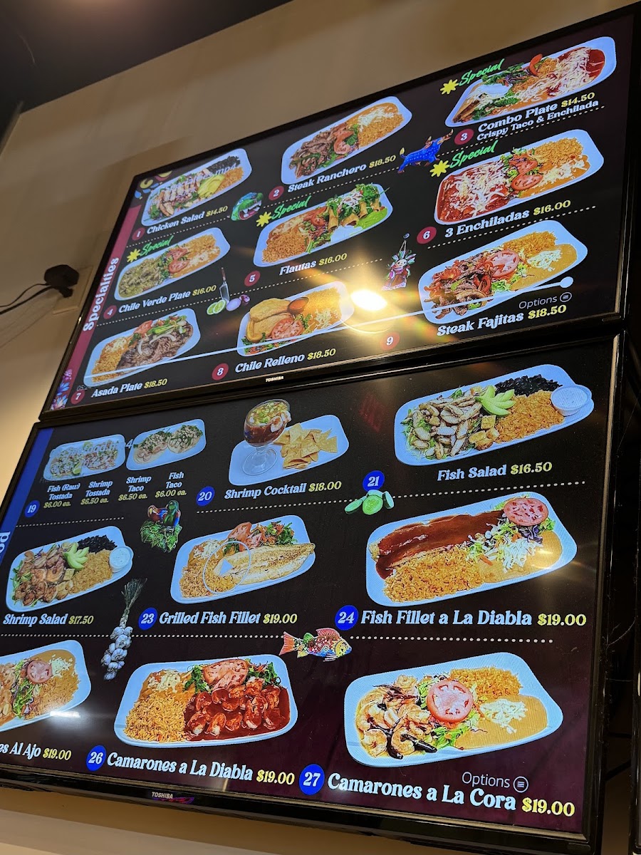The selections include a variety of tacos, from soft shrimp and fish tacos to crispy and cheesy options, alongside generous dinner plates like enchiladas and fajitas served with traditional sides such as rice and refried beans. The free salsa bar adds a hands-on element, inviting guests to customize flavors and create their perfect bite.